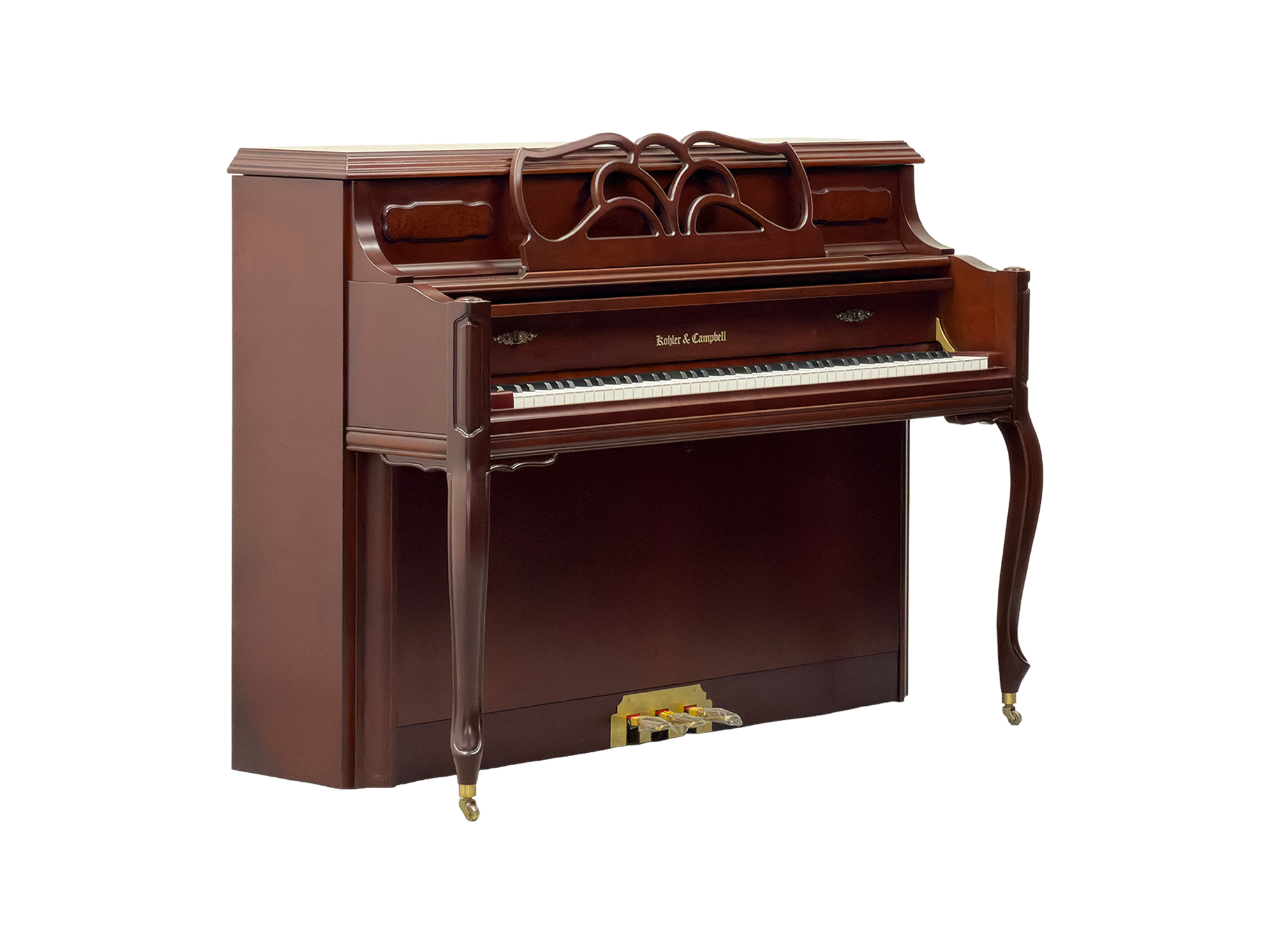 1896年ニューヨーク創業の老舗ブランド「Kohler & Campbell」のコンパクトモデル。高さ110cmと小型で圧迫感が少なく、リビングや子供部屋にも置きやすいサイズです。ウォールナット艶消し仕上げに猫脚・透かし彫り譜面台を備えた、家具のようなデザインが特長。鍵盤蓋のソフトランディング機構付きで、お子様の指挟み事故を防ぎます。