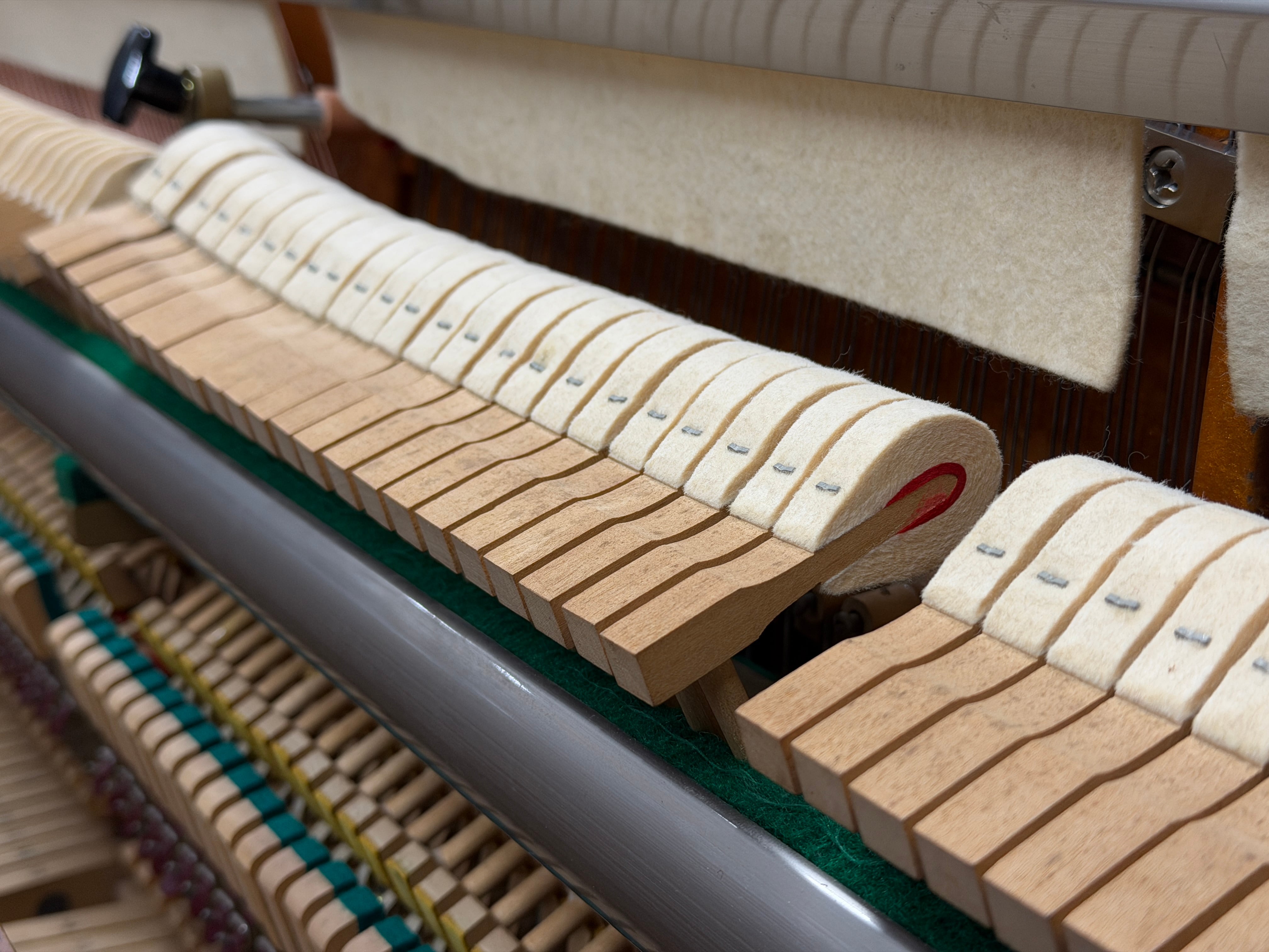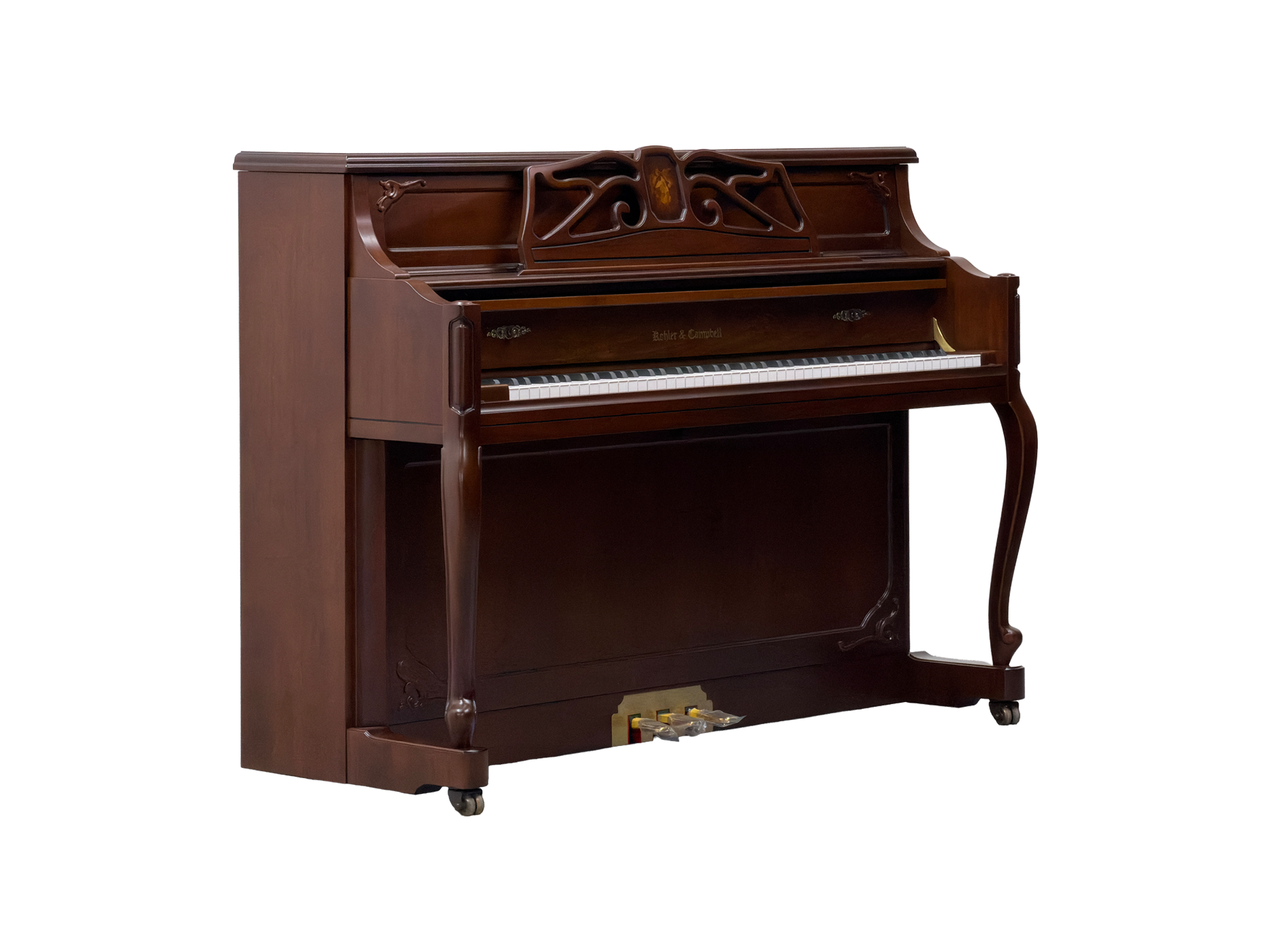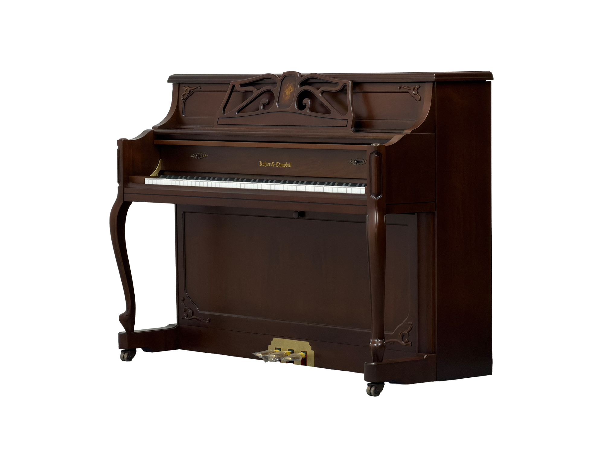 ウォールナット艶消し仕上げに猫脚、透かし彫り&象嵌(ぞうがん)入り譜面台を備えた、インテリア性の高い一台。浜松の自社工場にて調整済み。