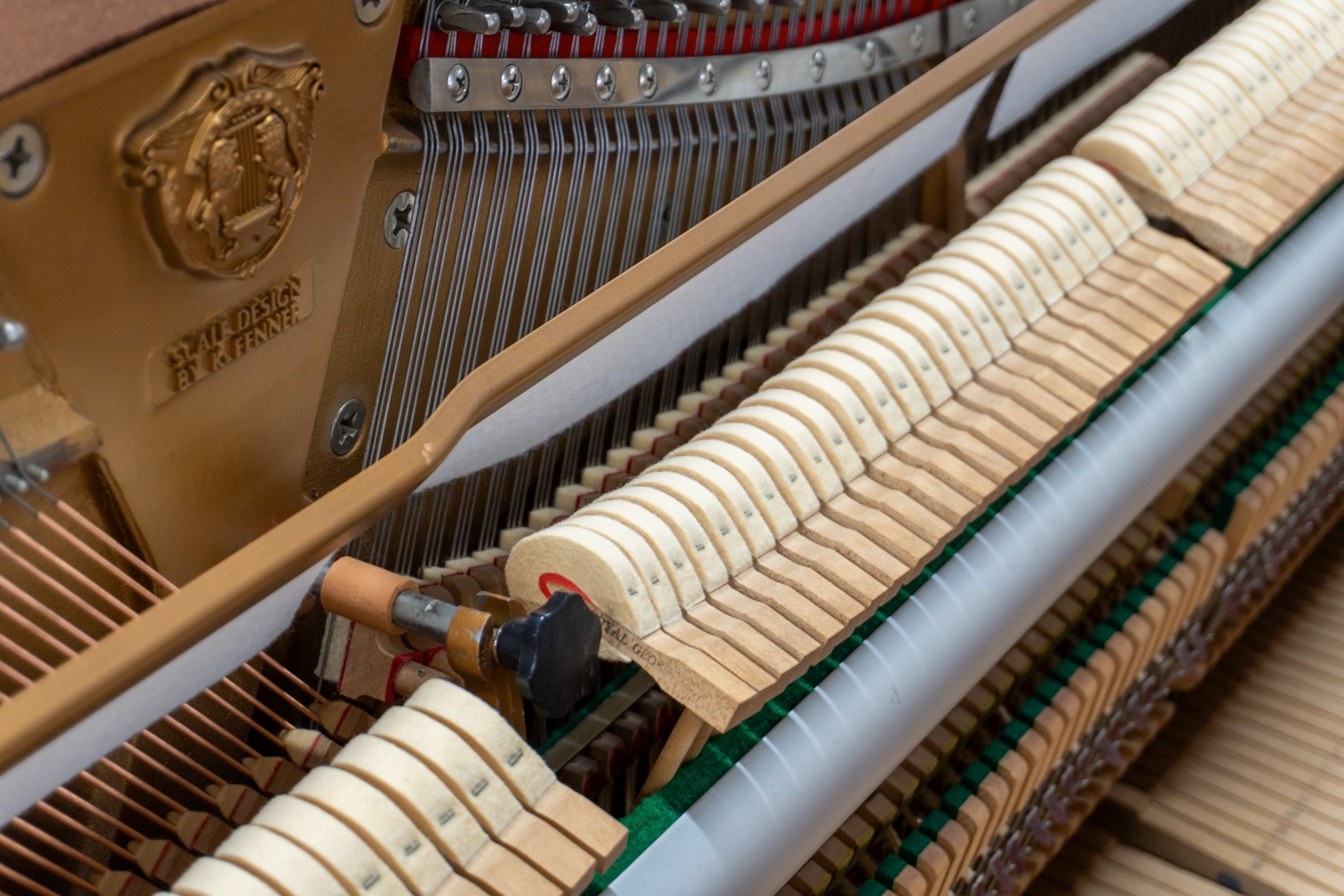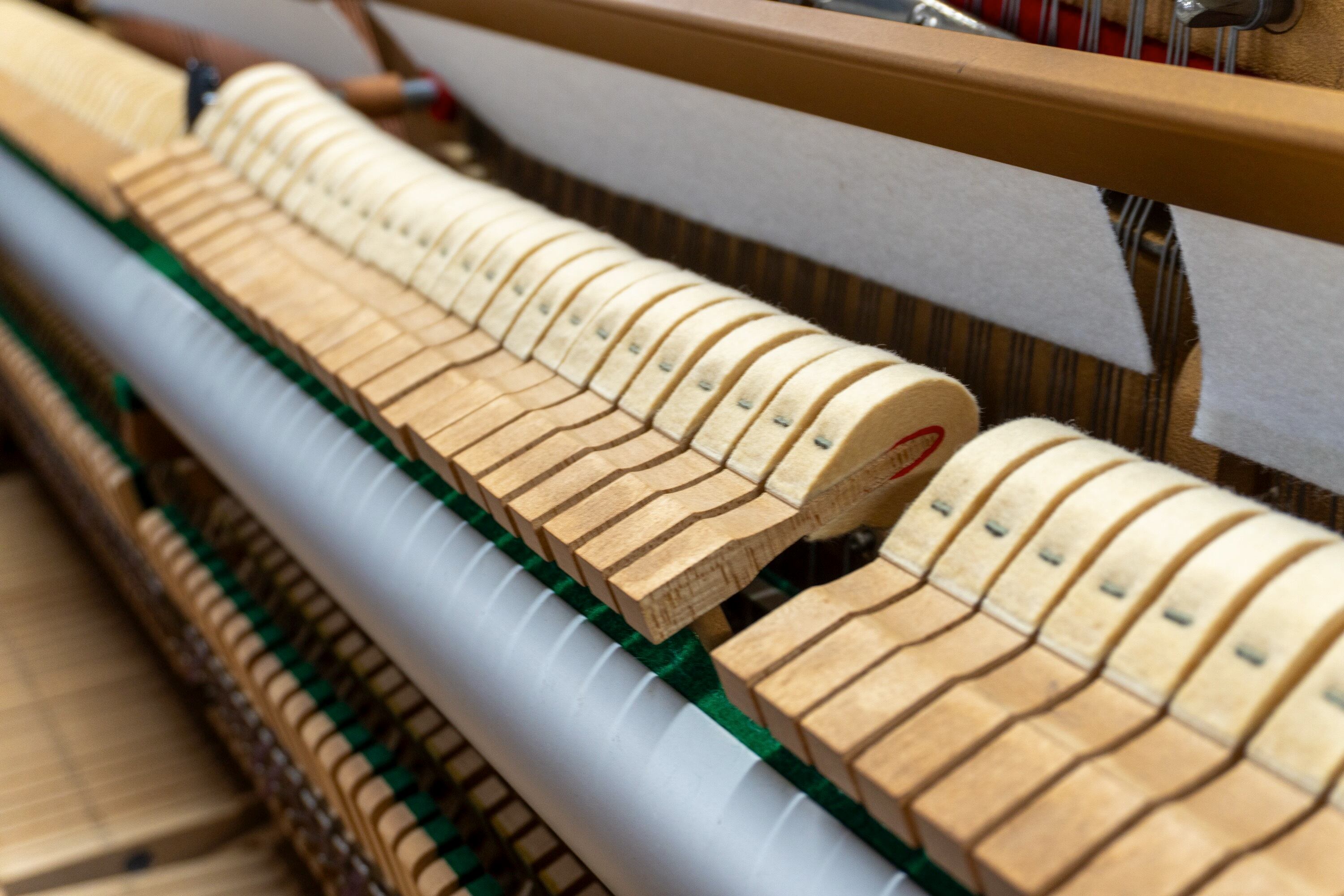 1896年ニューヨーク創業「Kohler & Campbell」の象嵌(ぞうがん)入りモデル。譜面台に異なる木材を組み合わせた象嵌細工が施されており、アンティーク家具のような重厚な存在感があります。