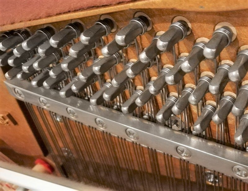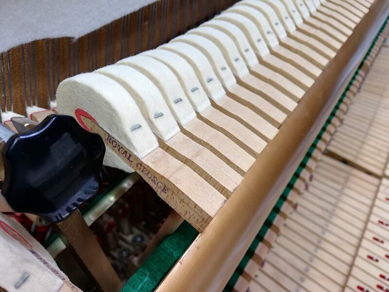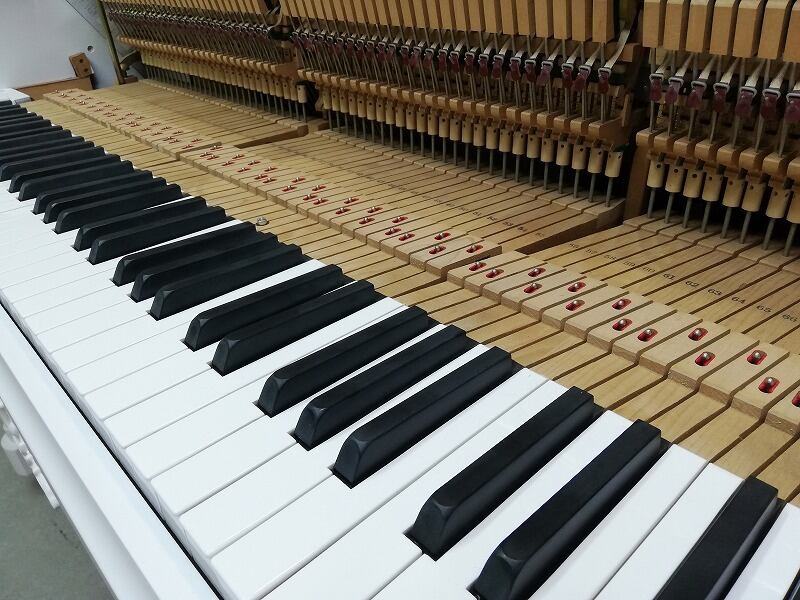 ストレート脚と透かし彫り譜面台を備えたエレガントなデザイン。浜松の自社工場で外装クリーニング・内部調整後、東京ショールームに展示中。
