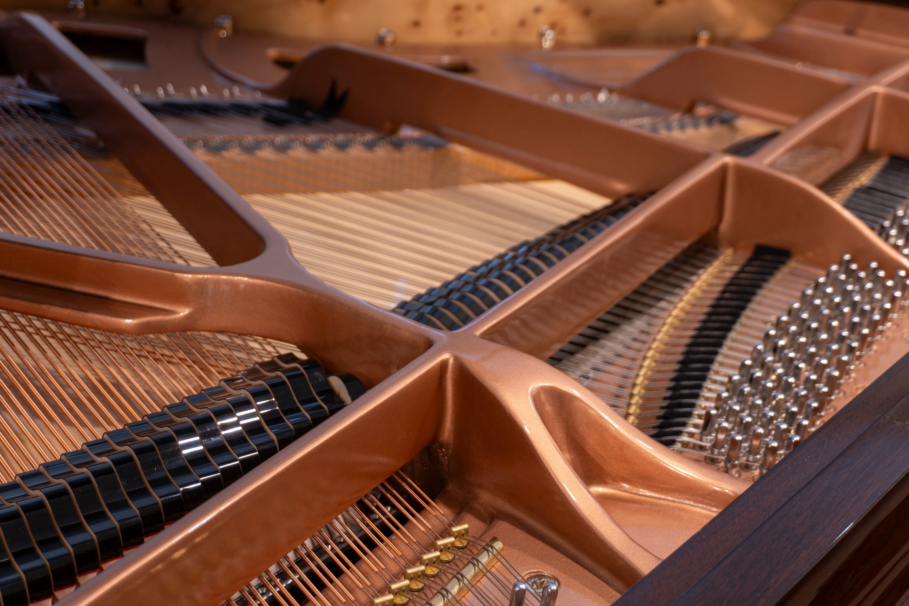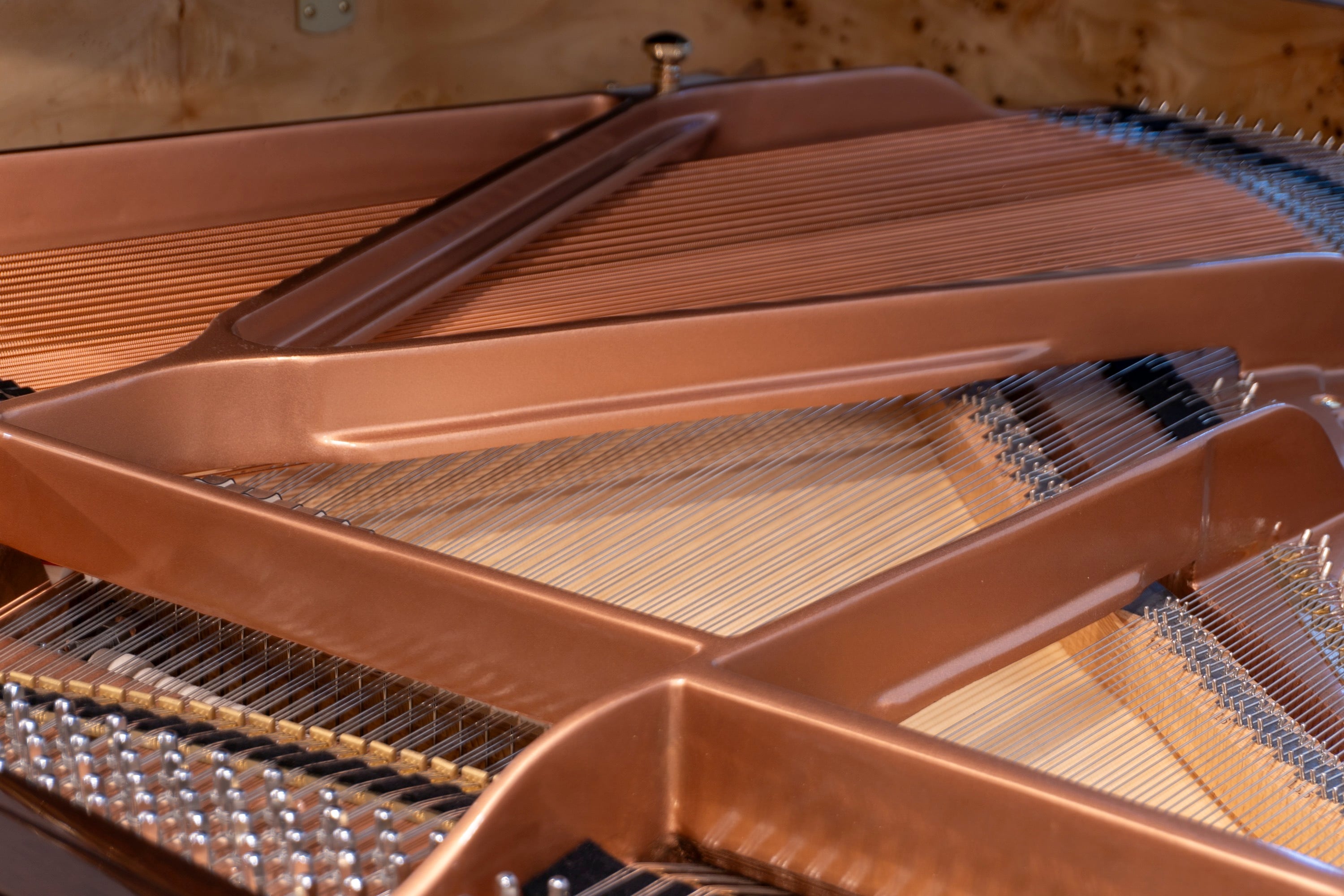 ウォールナット艶出し仕上げ。ドイツFFW社製ハンマーフェルトを採用し、浜松の自社工場にて最終調整を行ってから東京ショールームに展示しています。