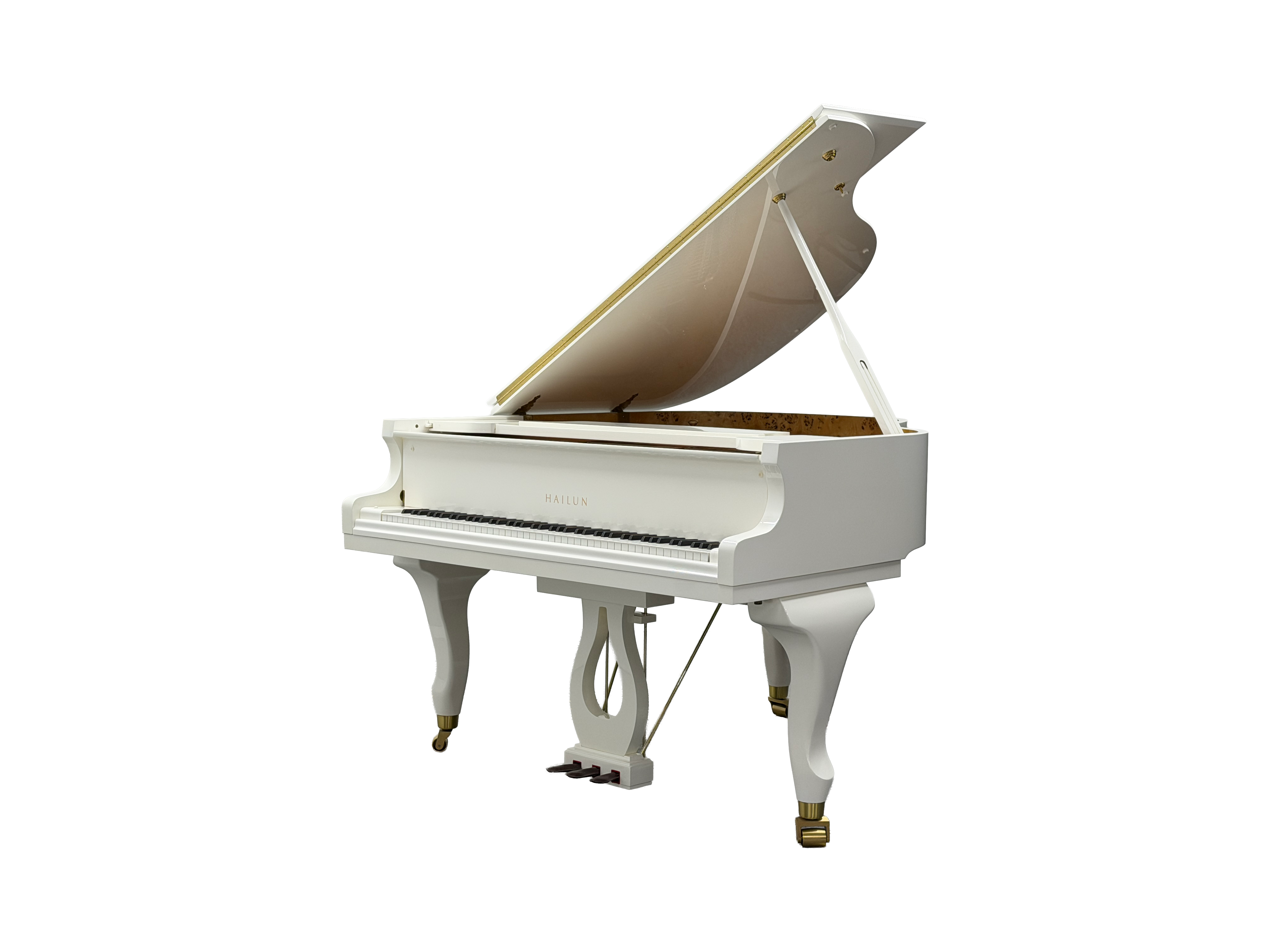 ホワイト鏡面艶出し仕上げに、チッペンデール(猫脚)とゴールドパーツを組み合わせたコンパクトグランドです。
